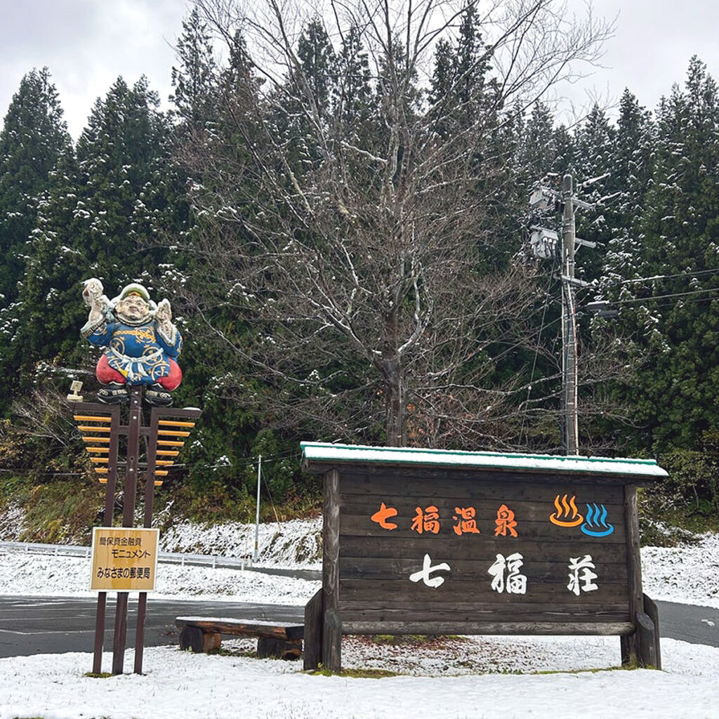 お世話になった七福荘さんの看板が雪景色の画像は4日前のものです。お客様のブログからお借りいたしました。 https://ameblo.jp/7978278/