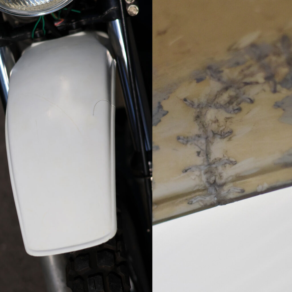 フロントフェンダー経年劣化で黄色く変色してましたがサンディングと熱加工によりだいぶ綺麗になりました。クラック部分は溶着し直しました。